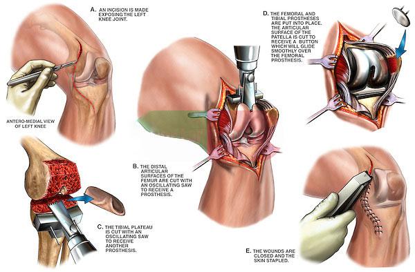 Knee replacement surgery — also known as knee arthroplasty can help relieve pain and restore function in severely diseased knee joints. The procedure involves cutting away damaged bone and cartilage from your thighbone, shinbone and kneecap and replacing it with an artificial joint (prosthesis) made of metal alloys, high-grade plastics and polymers.